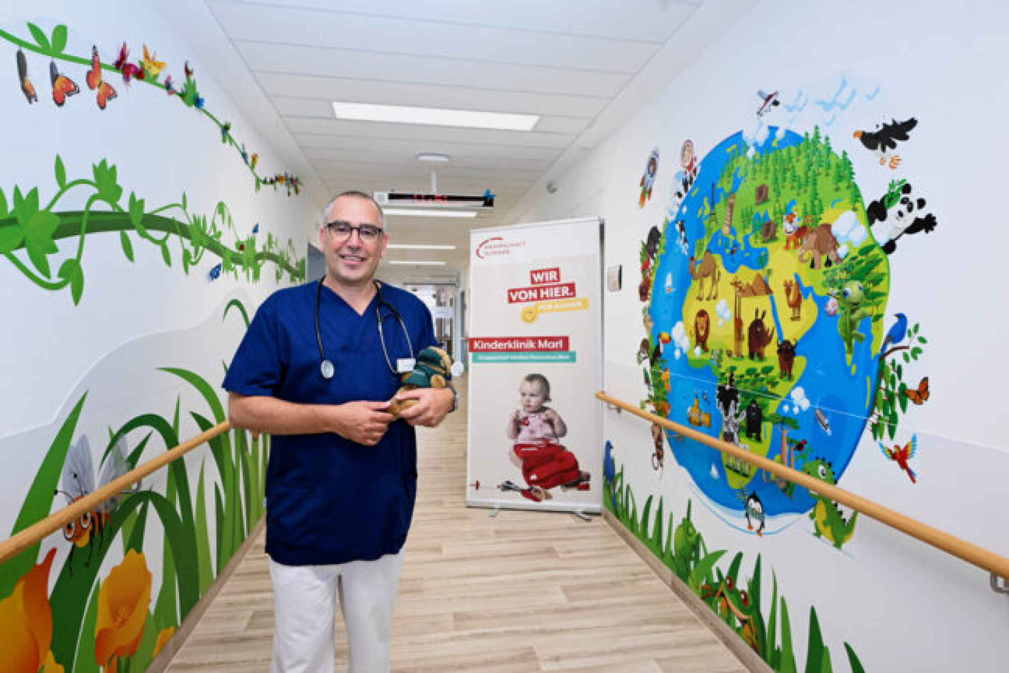 Chefarzt Dr. Andreas Wemhöner ist stolz, die Kinderklinik in den Knappschaft Kliniken Paracelsus Marl aufbauen zu dürfen. Er hat viele Pläne und ein hochmotiviertes interdisziplinäres Team an seiner Seite. Die pädiatrischen Fachärzte, Assistenzärzte und Pfleger und medizinischen Fachangestellten arbeiten in modernen Räumen, die auch den Patientinnen und Patienten gut gefallen, denn die Wände sind bunt gestaltet. Mal als Urwald, mal als Wüste, mal als Arktis – mit den entsprechenden Tieren.