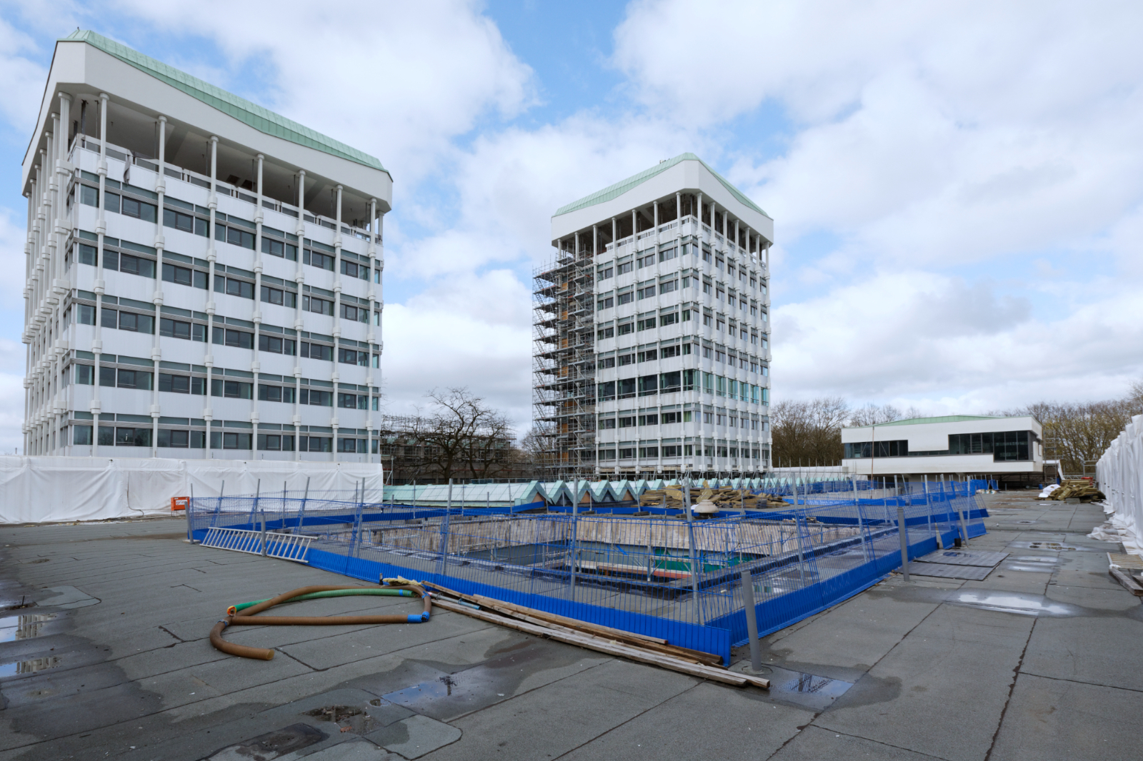 Auch die Arbeiten an Turm I und Turm II zeigen ein hohes Bautempo. „In beiden Türmen sind die Dachklempnerarbeiten abgenommen und zentrale brandschutztechnische Maßnahmen umgesetzt“, erläuterte Claas Frein, Leiter des Amtes für Gebäudemanagement. Trockenbau, technische Rohinstallationen sowie die Verlegung der Heiz- und Kühldecken befinden sich weitgehend im vorgesehenen Zeitplan. Parallel dazu schreiten die Arbeiten im Sitzungstrakt (Bauabschnitt 2) voran: Die Gerüstkonstruktion ist fertiggestellt und freigegeben, die Flachdachsanierung abgeschlossen und erste Schadstoffsanierungen an dem Faltwerk laufen.
